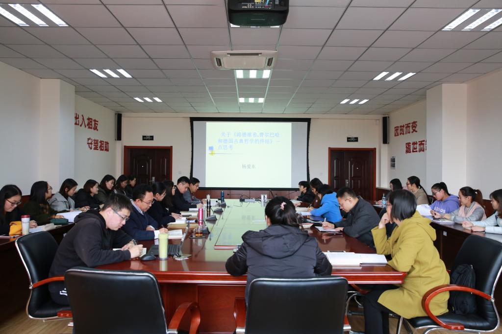 本次阅读经典的主讲人是支部党员杨爱东老师。杨老师主讲的内容是恩格斯的名篇《路德维希·费尔巴哈与德国古典哲学的终结》。杨老师首先分析了马克思恩格斯的唯物主义对旧哲学的扬弃,然后结合恩格斯对唯物主义的界定讨论了其对辩证法的深刻理解和对自然科学的伟大洞见,在最后的总结中,杨老师充分肯定了恩格斯在马克思主义哲学中的重要位置。