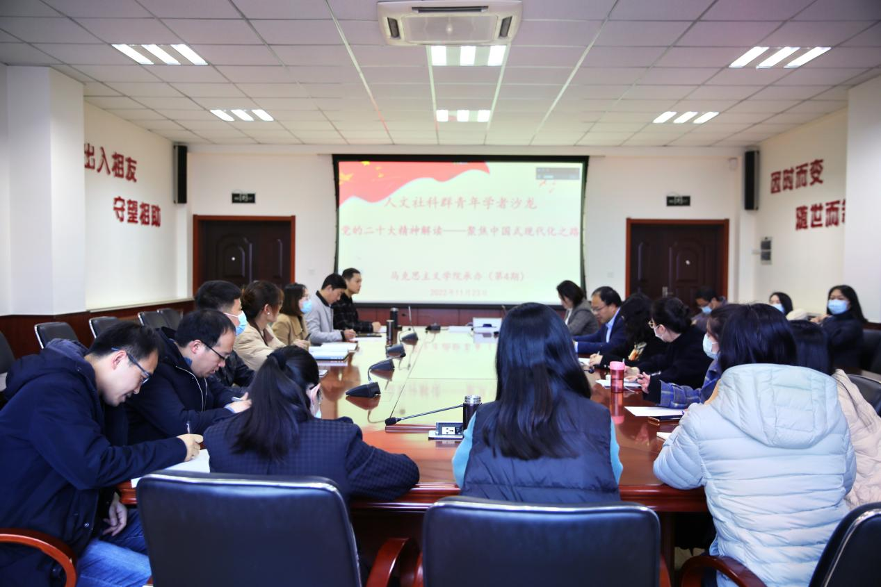 为深入学习贯彻党的二十大精神,深刻理解习近平新时代中国特色社会主义思想的丰富内涵、精神实质和实践要求。11月23日下午,由公司人文社会科学学科群主办,申博sunbet承办的学术沙龙活动在J9-227采用专家讲座和圆桌会议、线下线上相结合方式成功举办。活动由副经理邵勇主持,人文社科群各公司部分青年教师参加,申博sunbet硕士研究生线上旁听学习。本次活动的主题为“党的二十大精神解读——聚焦中国式现代化之路”,特别邀请公司副经理常春教授宣讲党的二十大精神,文法公司国虹副教授、公司贾强副教授、周月学术副教授、张建飞老师分别做主题发言。常春教授开篇点题,主要围绕中国式现代化的五个重要特征、本质要求、五项重大原则等展开论述,并结合二十大报告和当前学界对于这一问题的研究现状做了梳理,进而指出中国式现代化是当前学界热议、具有重大意义的热点问题。随后,国虹副教授讲述了现代化理论的缘起,并从线性发展历史角度分享了对于现代化的研究方法。贾强副教授则从恩格斯自然观视角切入、阐述了习近平生态文明思想所渗透的的辩证法思想。周月老师结合对全过程人民民主的研究,指出现代化所具备的三点元素,即成熟稳定制度、共同的价值理念、代表人类文明发展趋势。张健飞老师围绕“大历史观”视野指出,身处“两个大局”相互交织的关键时期,要顺应历史潮流,把握历史大势,增强历史主动。现场参会人员认真聆听、仔细记录。大家纷纷表示,沙龙准备充实、主题鲜明,紧扣时政热点,为学深悟透党的二十大精神搭建良好平台,一定要将焕发的思想自觉转化为科研教学源动力。