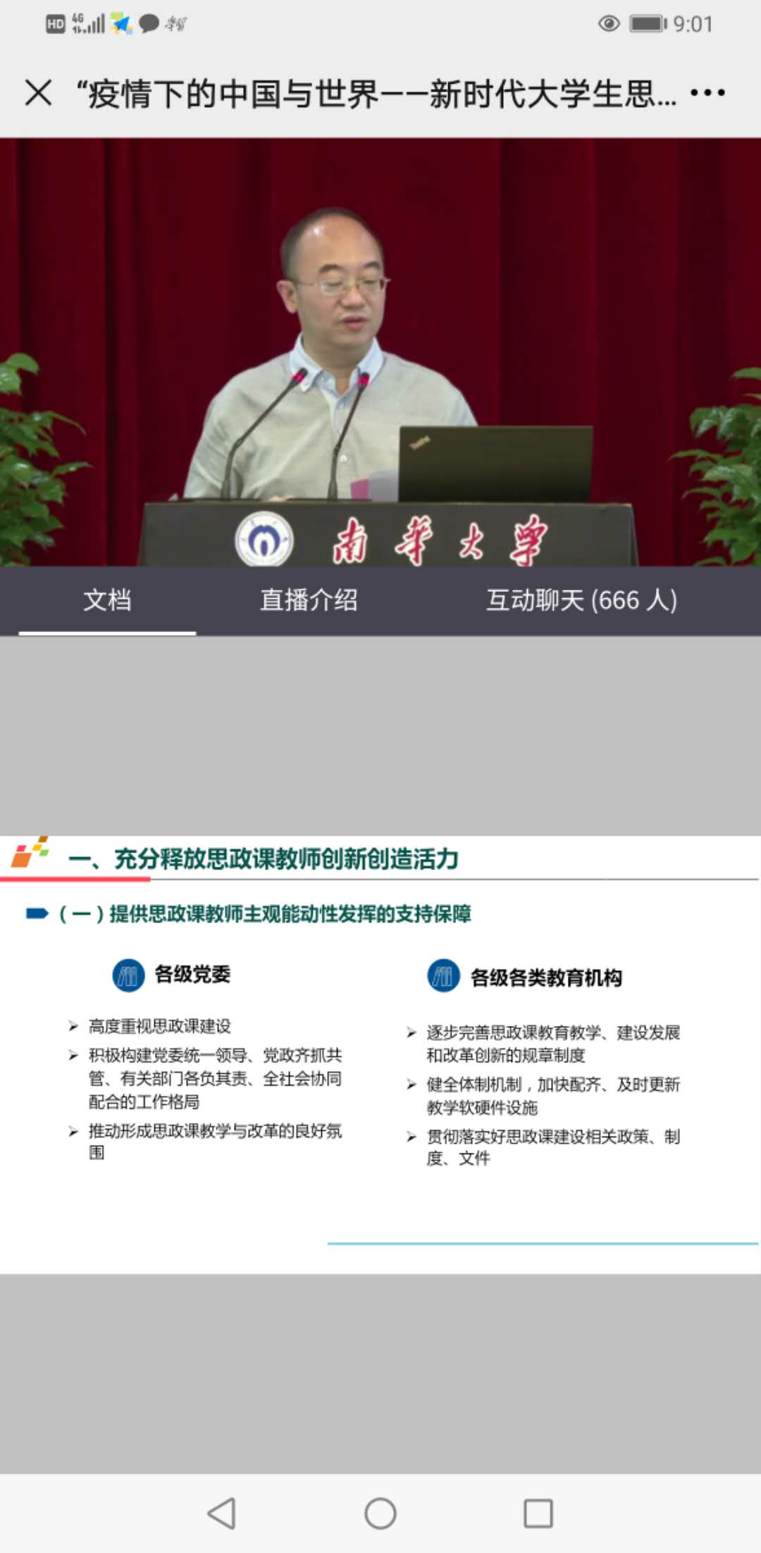 8月15日,“疫情下的中国与世界——新时代高校思想政治理论课改革创新”研讨会通过人民网公开课平台成功举办。本次大会由中国教育发展战略学会思想道德建设专业委员会、北京师范大学思想政治工作研究院和南华大学主办。会议采用“现场+直播连线”方式进行,公司领导班子及全体教师参加线上会议。